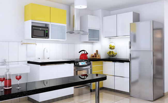 • Cocina de diseño moderno con mesa de granito y amoblada.