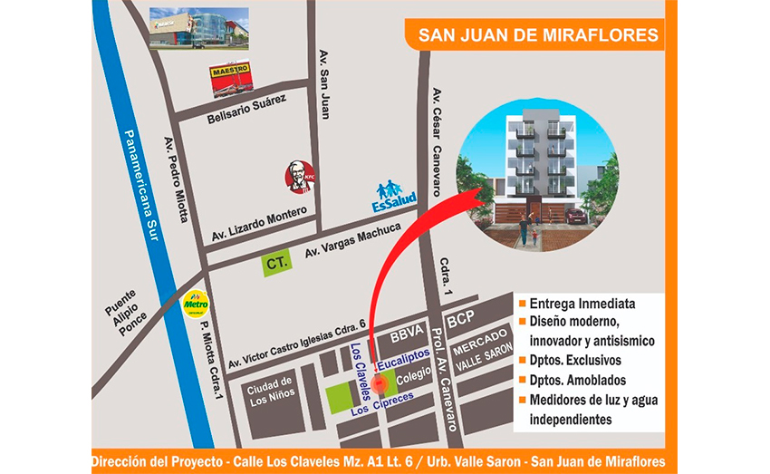 Ubicado en San Juan de Miraflores, Calle Los Claveles Mz A-1 lote 6 (frente a parque), altura de cuadra 6 Av. Víctor Castro Iglesias, cerca a parques, zonas de esparcimientos, bancos, colegios, cines, Centros comerciales como Maestro, Metro, el nuevo Mall del Sur y Av. principales. Les hacemos una cordial invitación para que visiten el depto. piloto en la dirección arriba señalada, de 9:30 am a 5:30 pm de L-D y brindarles toda la información que necesiten.